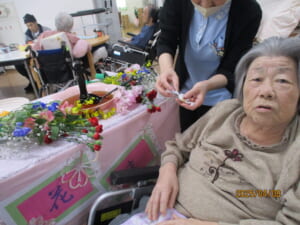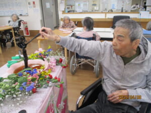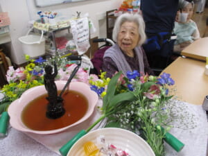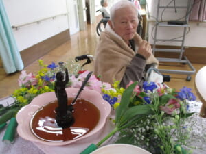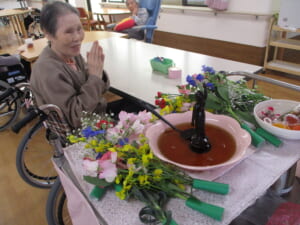 たくさんのきれいなお花に囲まれたお釈迦様に、甘茶をかけてお参りをしました。